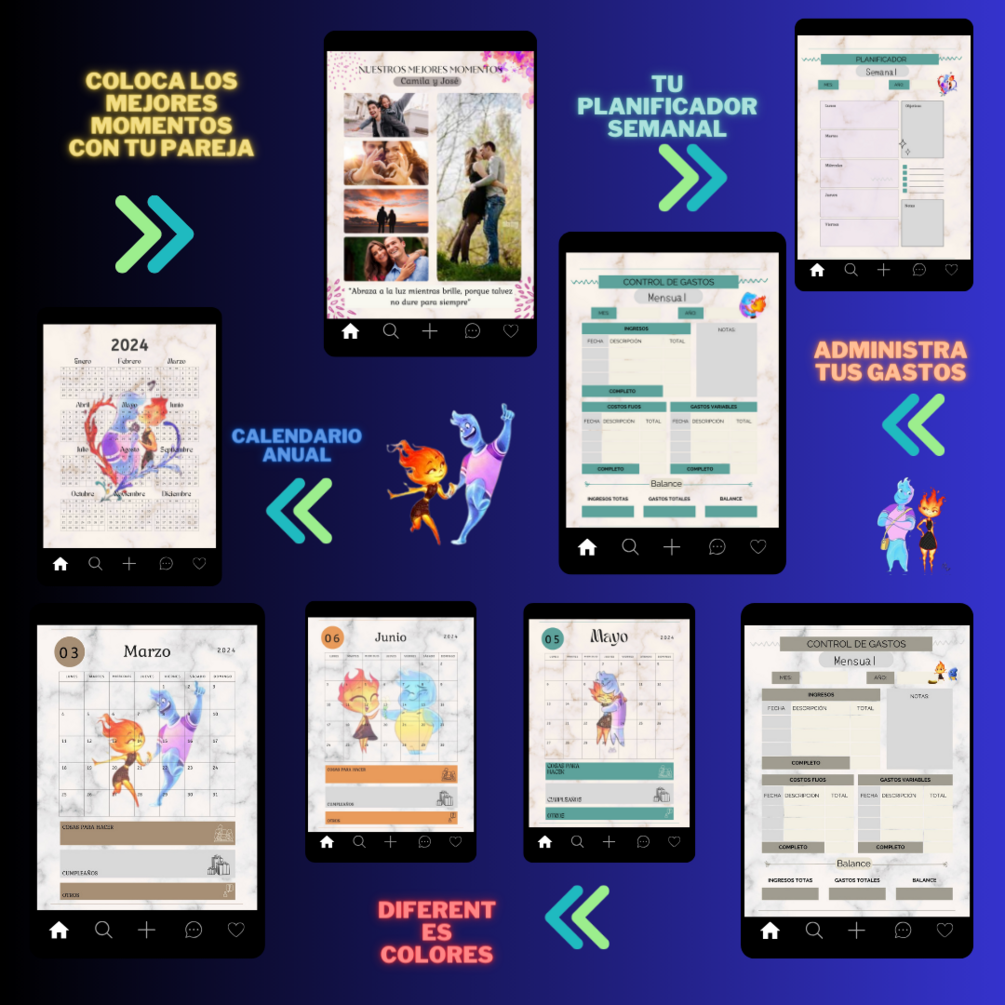 Our agenda has been designed to adapt to you and offer you the necessary tools to optimize your organization and achieve all your goals! Water and fire style cover, for couples. Includes: Annual calendar 2024. Customizable weekly planners and organizers (weekly spread) Track/Control monthly income, expenses and savings. Extra separator for notes and relevant information.